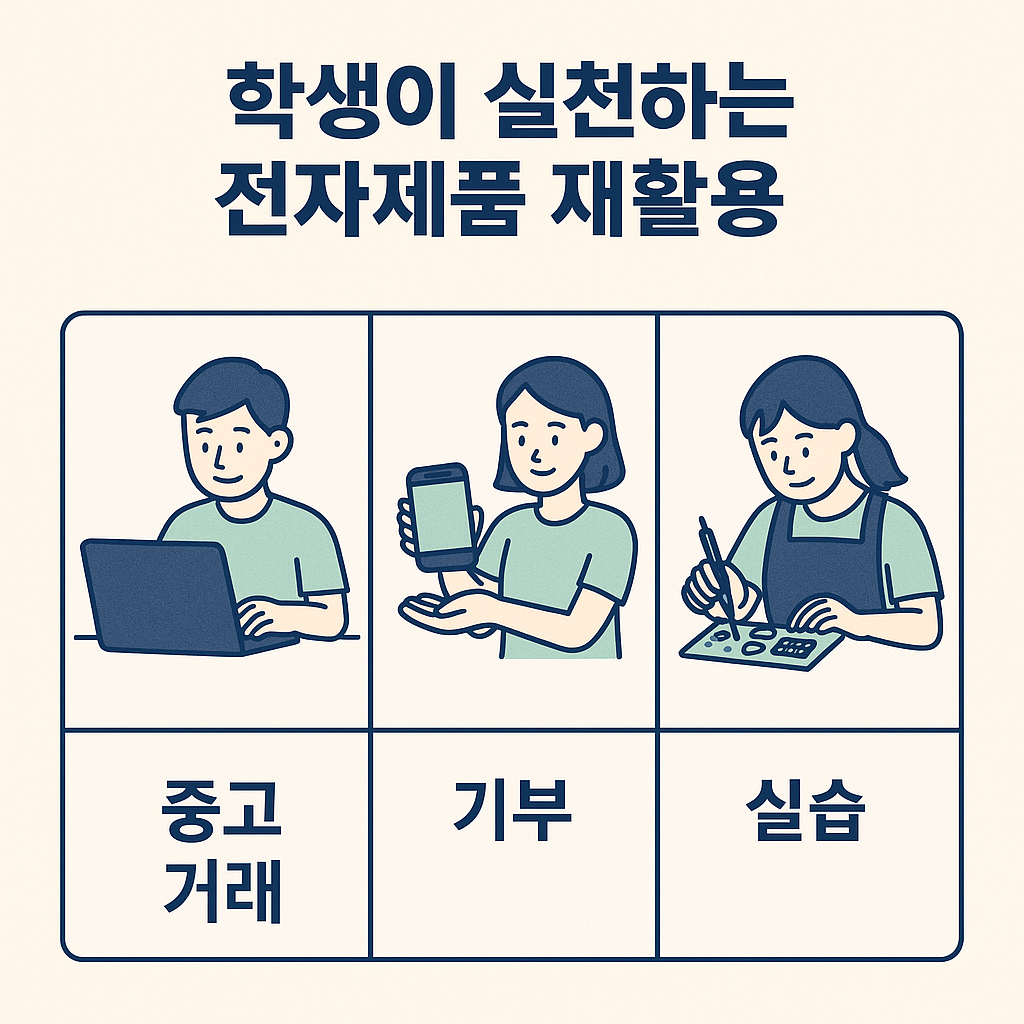 전자제품 재활용은 이제 어른들만의 과제가 아닙니다. 학생들도 중고거래, 기부, 실습 교육을 통해 일상 속에서 전자폐기물의 순환과 자원 절약에 기여할 수 있습니다. 작고 실천 가능한 행동 하나가 지구의 미래를 바꾸는 첫걸음입니다. 지금 여러분이 사용하는 노트북이나 스마트폰도, 누군가에게는 다시 쓰일 수 있는 소중한 자원이라는 사실을 잊지 마세요.